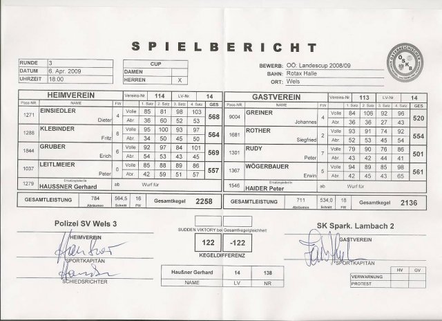 Endergebnis: 2258 : 2136 K. Für Pol.SV Wels 3.