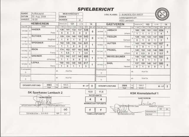 Das Freundschaftsspiel am Donnerstag den 20.08.2009 SK Sparkasse Lambach 2 gegen den Aufsteiger in die 1. Bundesliga dem KSK Kremstalerhof wurde spannender als erwartet. Haider Peter startete leicht verletzt gegen den Besten am heutigen Tag, Ambach Johann und Peter verlor mit 536 K. : 654 Kegel und 0 : 4. Rother Siegfried, der sonst so verlässliche Startspieler, spielte nur die erste Bahn sehr stark(159 K.) so konnte sein Gegner Fiedler Gerhard mit einer durchschnittlichen Leistung den Mannschaftspunkt sicherstellen. 543 : 550 und 2 : 2 Sp. für Fiedler.