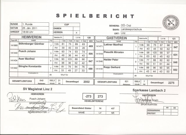 . . .musste in Linz auf der Gugl gegen SV Magistrat Linz in der 1. OÖ-Cuprunde einen Pflichtsieg einfahren. Der gelang beeindruckend mit 273 Kegel Vorsprung. Herausragend spielte die Leihgabe der Superliga, Miroslav Pesadik, der mit 631 Kegel Bestleistung der Auswärtsspieler auf der Gugl erreichte. |