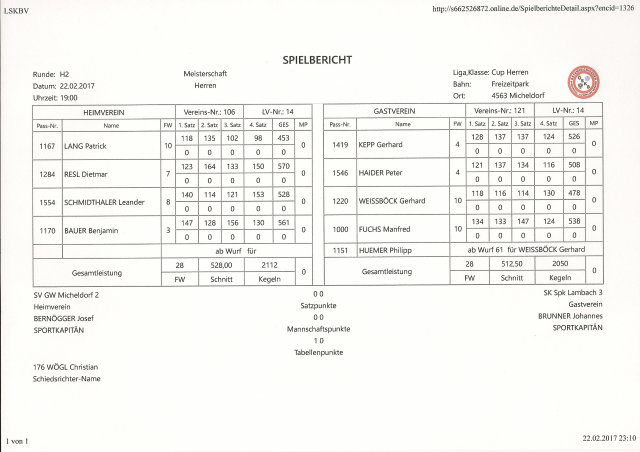 Kepp Gerhard konnte Lang Patrick 526 : 453 Kegel bezwingen. Haider Peter konnte Resl Dietmar nicht Paroli bieten und verlor mit 508 : 570 Kegel.