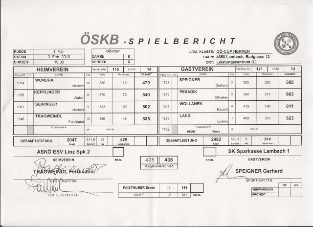 Die Mannschaft des ASKÖ ESV Linz Spk 2(2.LL) spielten das OÖ-Cupspiel aus Kostengründen auf unseren Bahnen gegen die Superliga-Mannschaft des SK Sparkasse Lambach.
