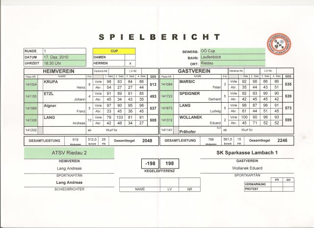 Endergebnis: 2048 : 2246 Kegel für die Lambacher |
