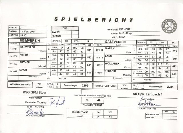 Im ersten Durchgang hatte Gauweiler Thomas und Peter Stefan von KSG GFM Steyr unseren beiden Marsic Petar und Lang Ludwig 115 Kegel abgenommen, die unsere beiden Schlussspieler Wollanek Eduard und Pesadik Miroslav nicht mehr gegen Artner Michael und Mach Rudolf aufholen konnten.