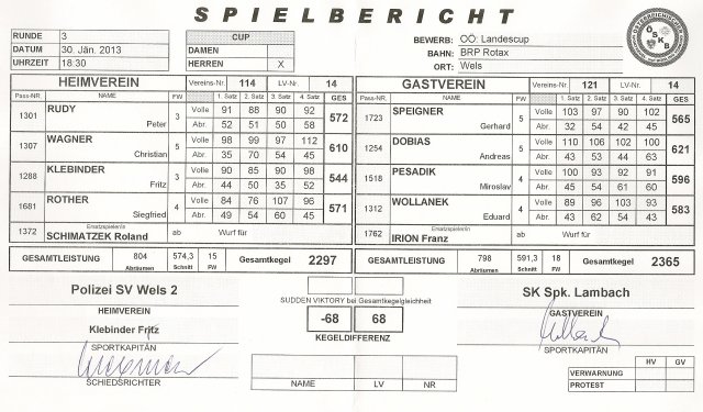 Zum Einzug ins OÖ-Cupfinale musste noch die OÖ-Liga-Mannschaft Polizei SV Wels 2 in der BRP-Rotax-Halle besiegt werden. Es spielten bei Lambach wieder die gleichen 4 Spieler. Dobias Andi spielte ausgezeichnete 621 Kegel. Miro erreichte 596 Kegel, Edi 583 und Gerhard 565 Kegel. Das reichte mit 68 Kegel zum Sieg für Lambach. |